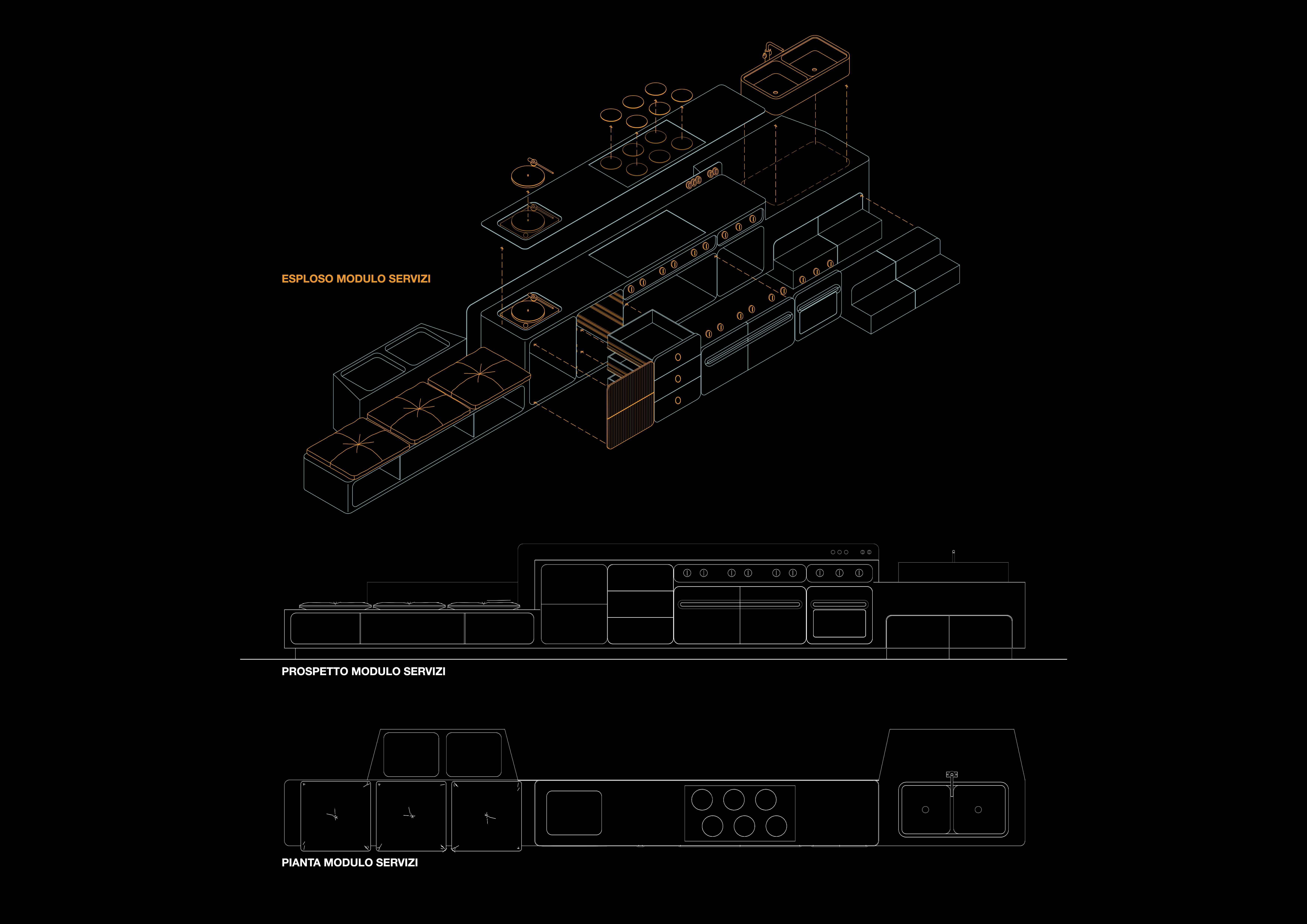 Raw existing walls stay as time-traces, while brushed-aluminium “Capsules” float as future artifacts: